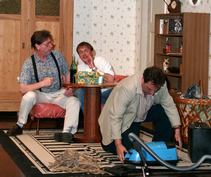 Was der Zuschauer längst ahnt, hält die Akteure auf der Bühne eine Weile gehörig auf Trab: Das Missverständnis klärt sich nicht so schnell, denn beide Detektive glänzen nur durch ihre technische Ausrüstung, nicht jedoch durch Scharfsinn und Einfallsreichtum. Noch dümmer stellt sich nur noch Jago an, ein kleiner Dealer mit großer Klappe. Ihm gelingt es, seinen gesamten Pillenvorrat im Hause Wäscher zu verlieren. Auf Jago scharf sind Alex und Babsi Wäscher, die Kinder von Karin und Werner: Alex will Jago verdreschen und Babsi findet ihn „ja sooo cool“.