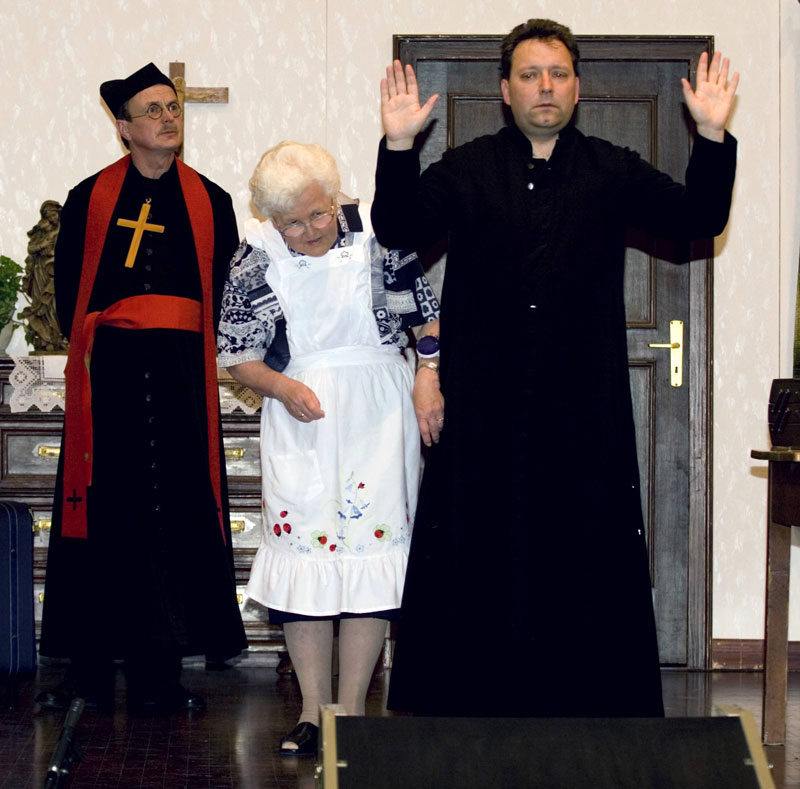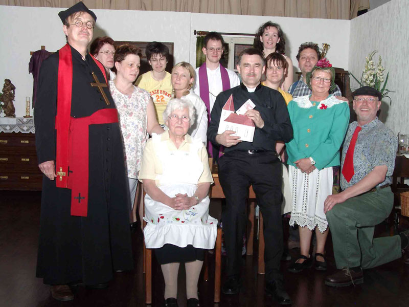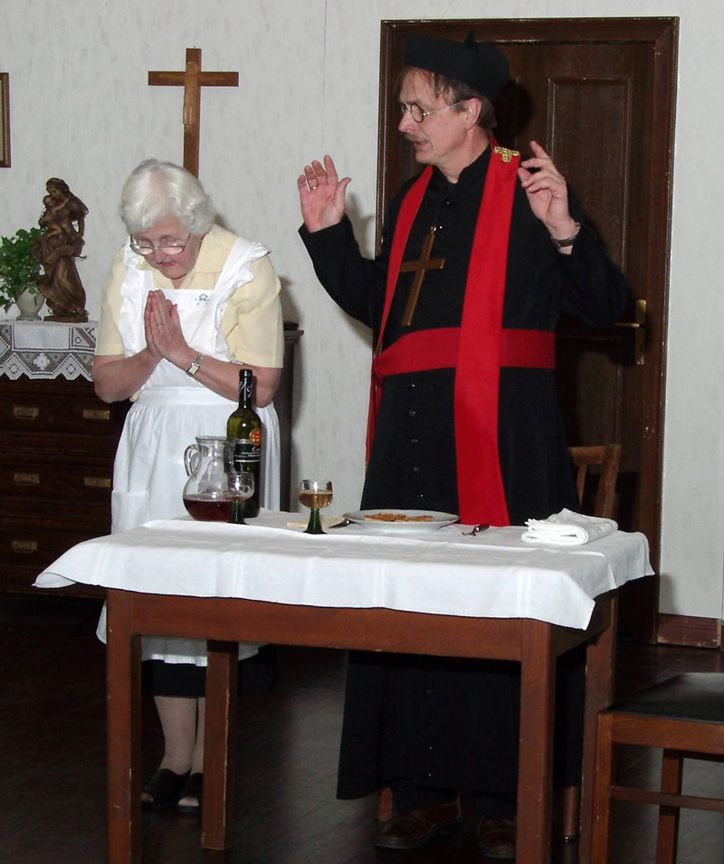 Dabei schreckt er sogar vor nächtlichen Kartenspielen im Pfarrhaus nicht zurück. Sein arbeitsscheuer, aber dafür um so geselliger Küster Johannes Höll wird zwar von seiner resoluten Frau Emma auf Trab gehalten, ist dem Pfarrer aber zumindest beim Kartenspiel ein eifriger Helfer. Pfarrhaushälterin Hermine, die ihrem „Chef` treu und ergeben dient, will dagegen den Pfarrer immer auf den „richtigen“ Weg bringen. Die Pfarrgemeinderatsvorsitzende Elfriede Engel – von allen aufgrund ihrer Scheinheiligkeit nur „Erzengel“ genannt – soll eigentlich Spenden für die Renovierung der Kirche sammeln. Ihre einzige Sorge gilt jedoch ihrem guten Abschneiden bei den anstehenden Pfarrgemeinderatswahlen; sogar ihre Nichte Uschi will sie gegen ihren Willen in ein Kloster stecken, nur um dadurch ihre Erfolgschancen bei der Wahl zu steigern.