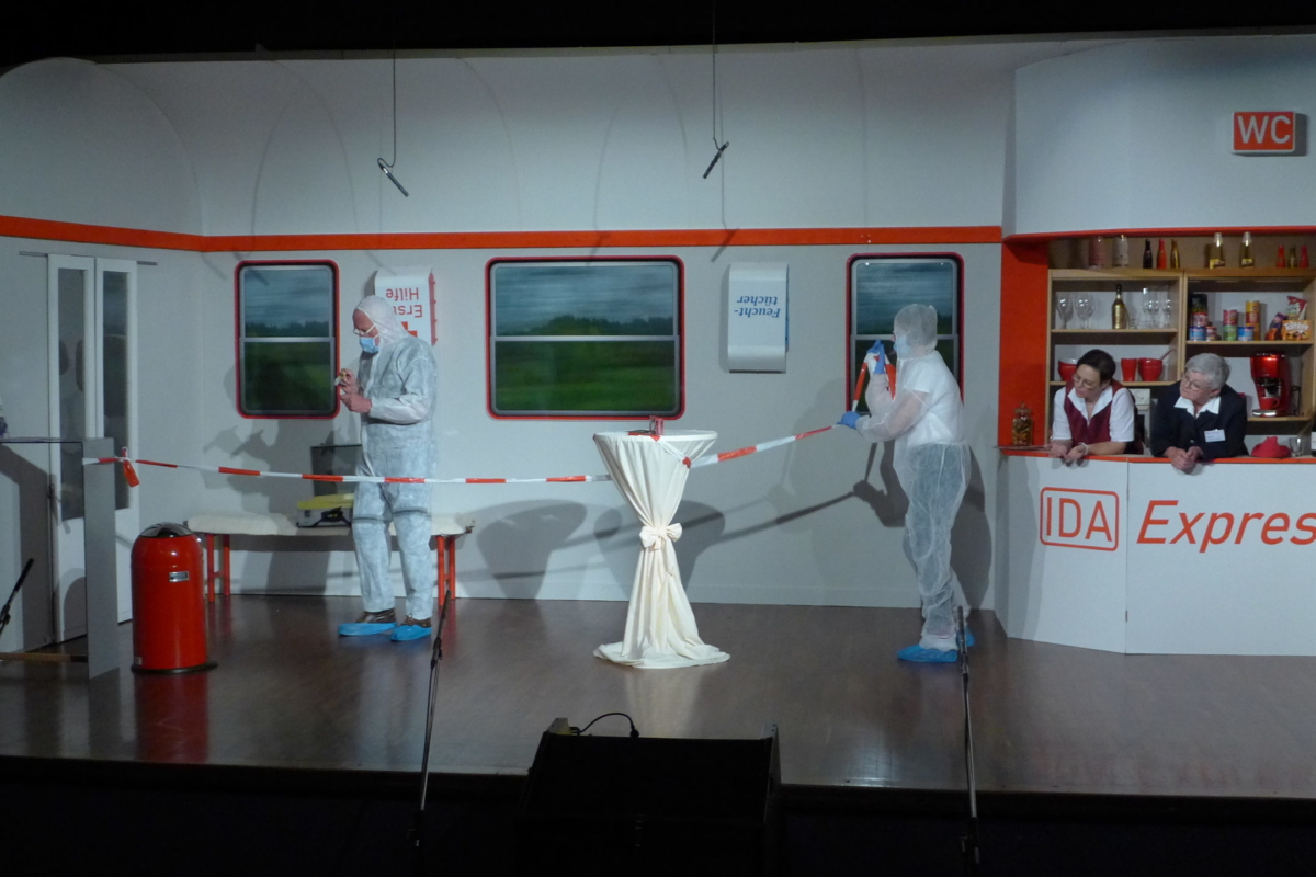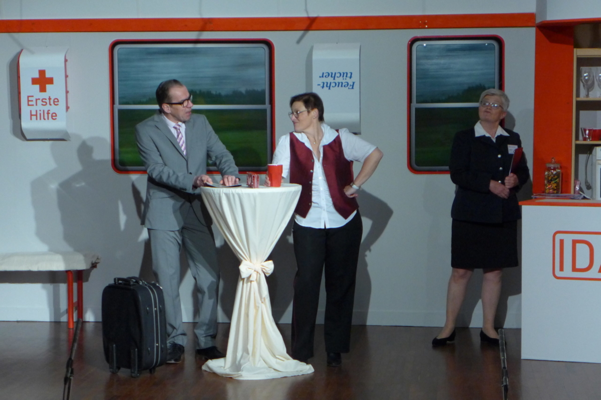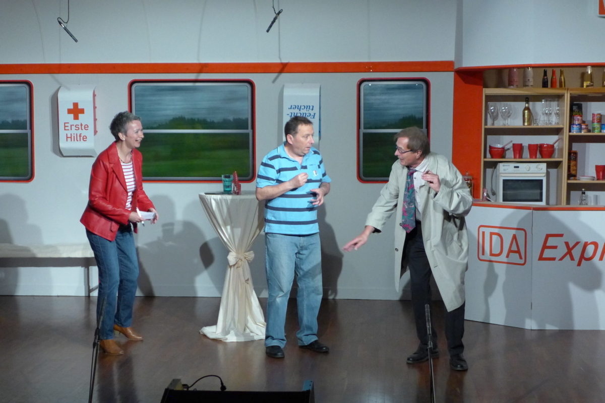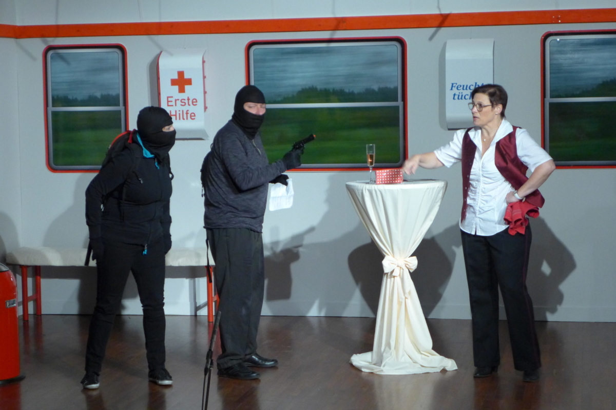 Bahn fahren ist für Sie wie saures Rhabarberkompott? Sie sind unzufrieden mit dem Fahrgastpersonal? Oder scheitern Sie bereits am Preissystem? Glückwunsch! Denn nach dieser Fahrt, werden Sie „Ihre Bahn“ wieder so richtig zu schätzen wissen! Wetten…? Begleiten Sie dabei Rudolf und Kati bei ihrem spektakulären Überfall auf das Bordbistro im „IDA–Express“. – einer privatisierten Zuglinie mit gut situierten Fahrgästen, die auf der Fahrt von Hamburg quer durch Deutschland über Messel bis nach Wiesbaden mit exklusivem Champus–Angebot verwöhnt werden sollen. Die Umsetzung wirkt dabei für das Räuberduo ebenso genial wie einfach: Das Bordbistro wird überfallen, die prall gefüllte Kasse an sich genommen und der einzige Zwischenhalt, in Messel, zum Verschwinden genutzt. Allerdings machen die Tücken einer Bahn–Privatisierung selbst vor unseren beiden Räubern nicht halt. So wird zwar das Bistro überfallen, die Kasse auch an sich genommen; nur der Zwischenhalt zum Verschwinden, der fällt aus. – wegen einer „Störung im Betriebsablauf“! Und so wird der Überfall nun für unsere Räuber bis zur Ankunft in Wiesbaden zum Spießroutenlauf, bei dem sich die Frage stellt, was für das Publikum lustiger ist: Das immer wieder neue Improvisationstheater unseres Räuberpärchens, das ständige Versteckspiel mit der Beute oder das zur Privatisierung „verdammte“ Bahnpersonal!?
