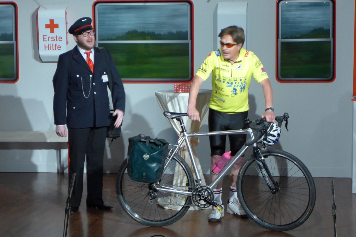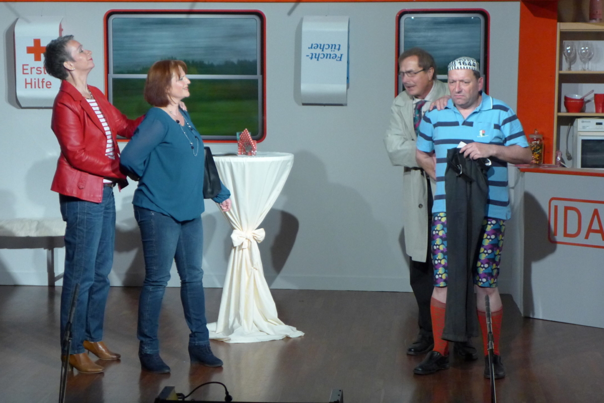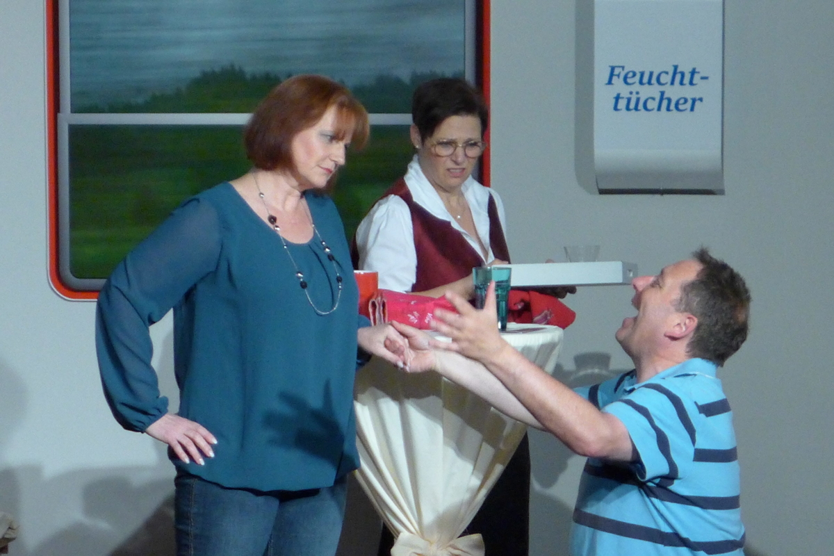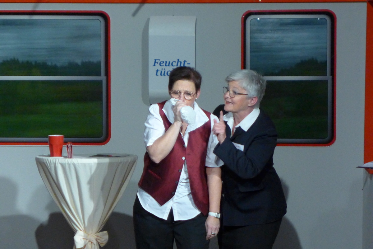 Bahn fahren ist für Sie wie saures Rhabarberkompott? Sie sind unzufrieden mit dem Fahrgastpersonal? Oder scheitern Sie bereits am Preissystem? Glückwunsch! Denn nach dieser Fahrt, werden Sie „Ihre Bahn“ wieder so richtig zu schätzen wissen! Wetten…? Begleiten Sie dabei Rudolf und Kati bei ihrem spektakulären Überfall auf das Bordbistro im „IDA–Express“. – einer privatisierten Zuglinie mit gut situierten Fahrgästen, die auf der Fahrt von Hamburg quer durch Deutschland über Messel bis nach Wiesbaden mit exklusivem Champus–Angebot verwöhnt werden sollen. Die Umsetzung wirkt dabei für das Räuberduo ebenso genial wie einfach: Das Bordbistro wird überfallen, die prall gefüllte Kasse an sich genommen und der einzige Zwischenhalt, in Messel, zum Verschwinden genutzt. Allerdings machen die Tücken einer Bahn–Privatisierung selbst vor unseren beiden Räubern nicht halt. So wird zwar das Bistro überfallen, die Kasse auch an sich genommen; nur der Zwischenhalt zum Verschwinden, der fällt aus. – wegen einer „Störung im Betriebsablauf“! Und so wird der Überfall nun für unsere Räuber bis zur Ankunft in Wiesbaden zum Spießroutenlauf, bei dem sich die Frage stellt, was für das Publikum lustiger ist: Das immer wieder neue Improvisationstheater unseres Räuberpärchens, das ständige Versteckspiel mit der Beute oder das zur Privatisierung „verdammte“ Bahnpersonal!?